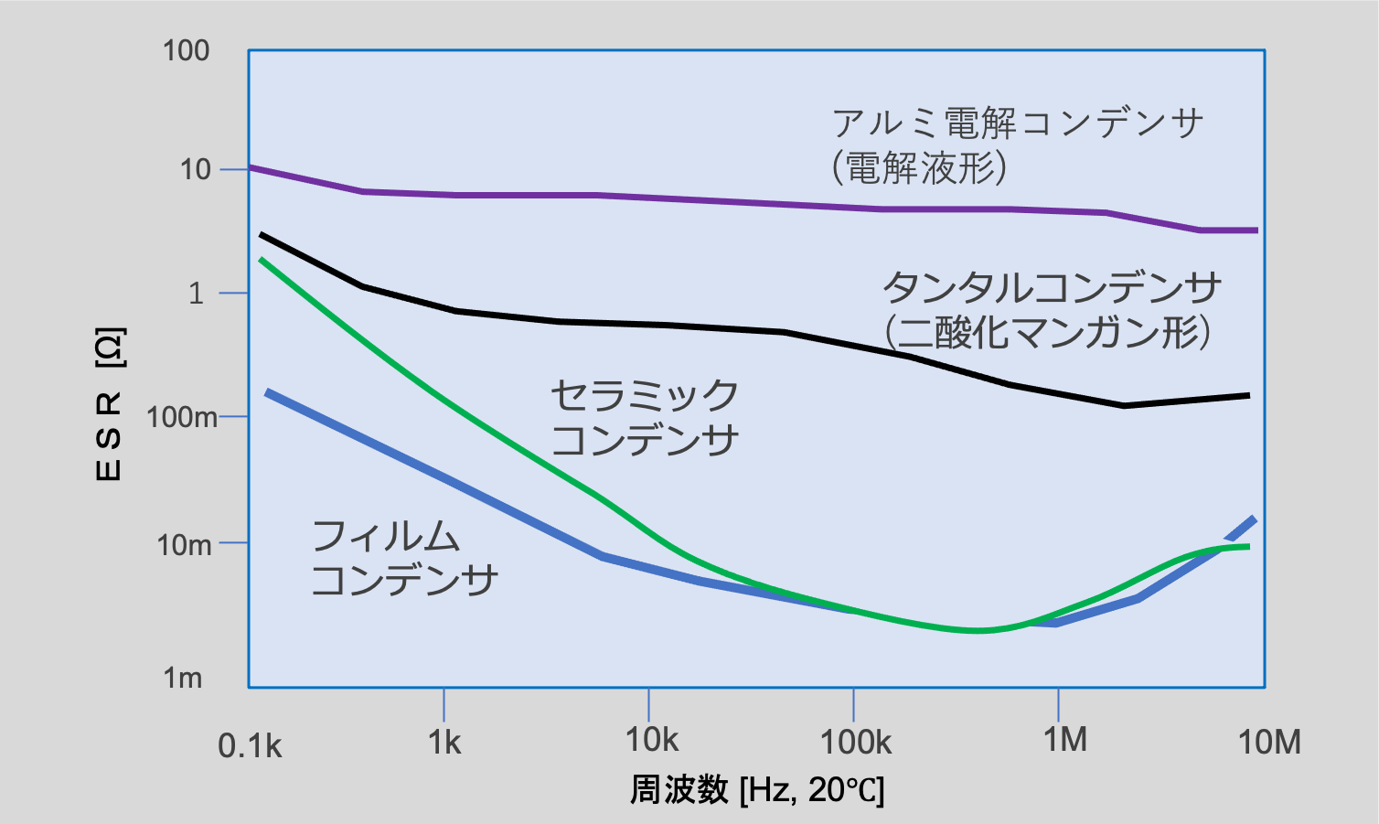 コンデンサメーカのデータシートにあるESRは、温度20~25℃、周波数120Hzや100kHzでの値が載っています。しかしコンデンサメーカや品種によっては低温やさまざまな周波数におけるESRを規定している場合があります。このため、アプリケーションの環境温度や動作周波数に対して適切なESRを持ったコンデンサを選定するには、メーカへの問合せが必要です。