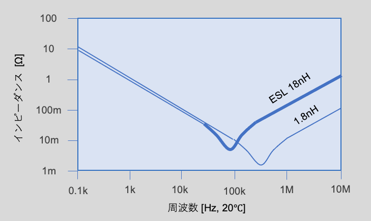 式(14)は、インダクタンスが小さいほど共振周波数が高くなることを示しており、図10に示すように低インダンスのコンデンサほど高周波でのインピーダンスが小さくなり、より高いスイッチング周波数の回路で使用できるようになります。