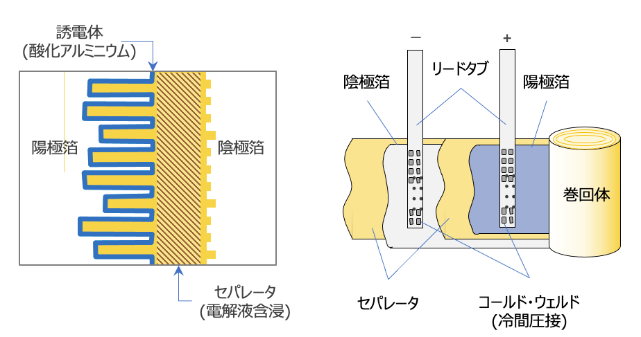 セパレータは陽極箔と陰極箔が直接接触することを防止し、同時に電解液を保持して電解液の機能を維持します。このため、電解液を蓄えやすい低密度のセパレータが低ESRに好適です*21。