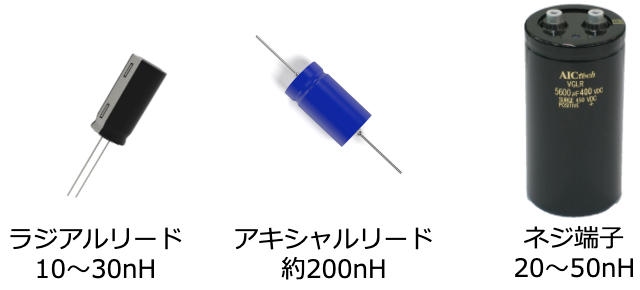 - アルミ電解コンデンサは他のコンデンサよりもESRが大きく、リード線などに起因するESLがあります。